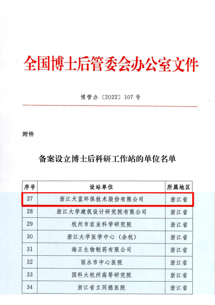浙江天藍(lán)環(huán)保技術(shù)股份有限公司獲批國家級博士后工作站,標(biāo)志著天藍(lán)環(huán)保在人才隊伍、技術(shù)創(chuàng)新和科研平臺建設(shè)上的重大突破。