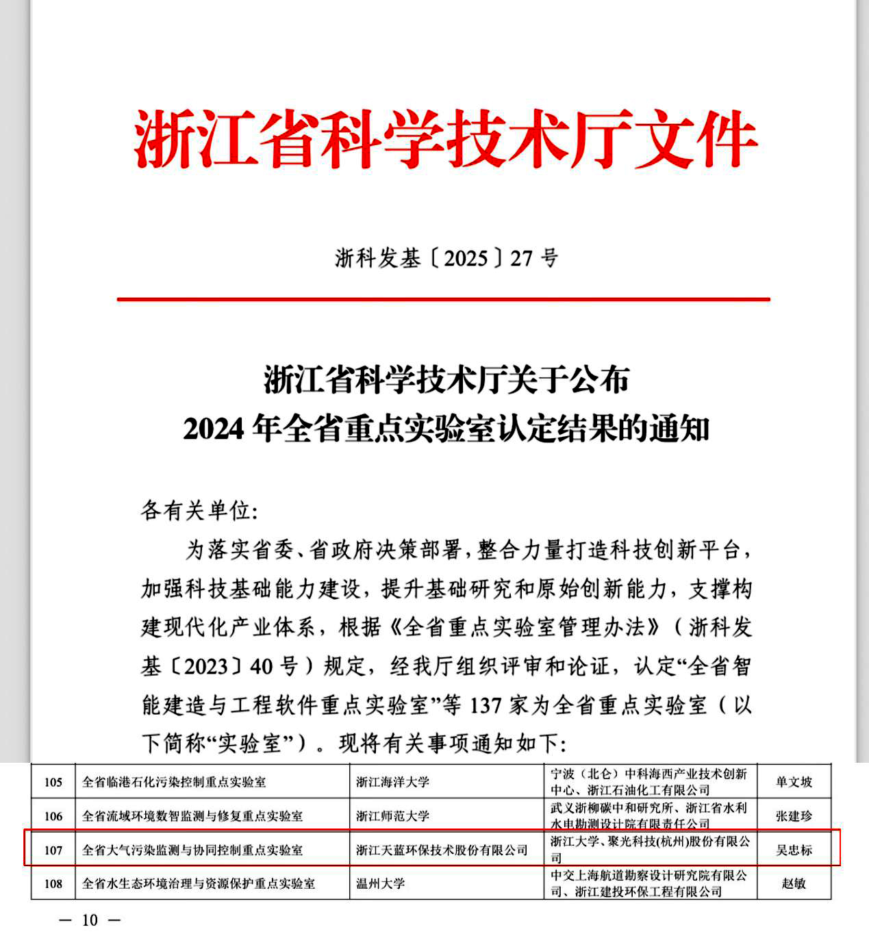 2025年6月4日,浙江省科技廳發(fā)布《浙江省科學(xué)技術(shù)廳關(guān)于公布2024 年全省重點實驗室認(rèn)定結(jié)果的通知(浙科發(fā)基〔2025〕27號)》,由浙江天藍(lán)環(huán)保技術(shù)股份有限公司牽頭,浙江大學(xué)和聚光科技(杭州)股份有限公司共建的“全省大氣污染監(jiān)測與協(xié)同控制重點實驗室”獲批組建,成為全省環(huán)境領(lǐng)域唯一以企業(yè)牽頭建設(shè)的省級重點實驗室